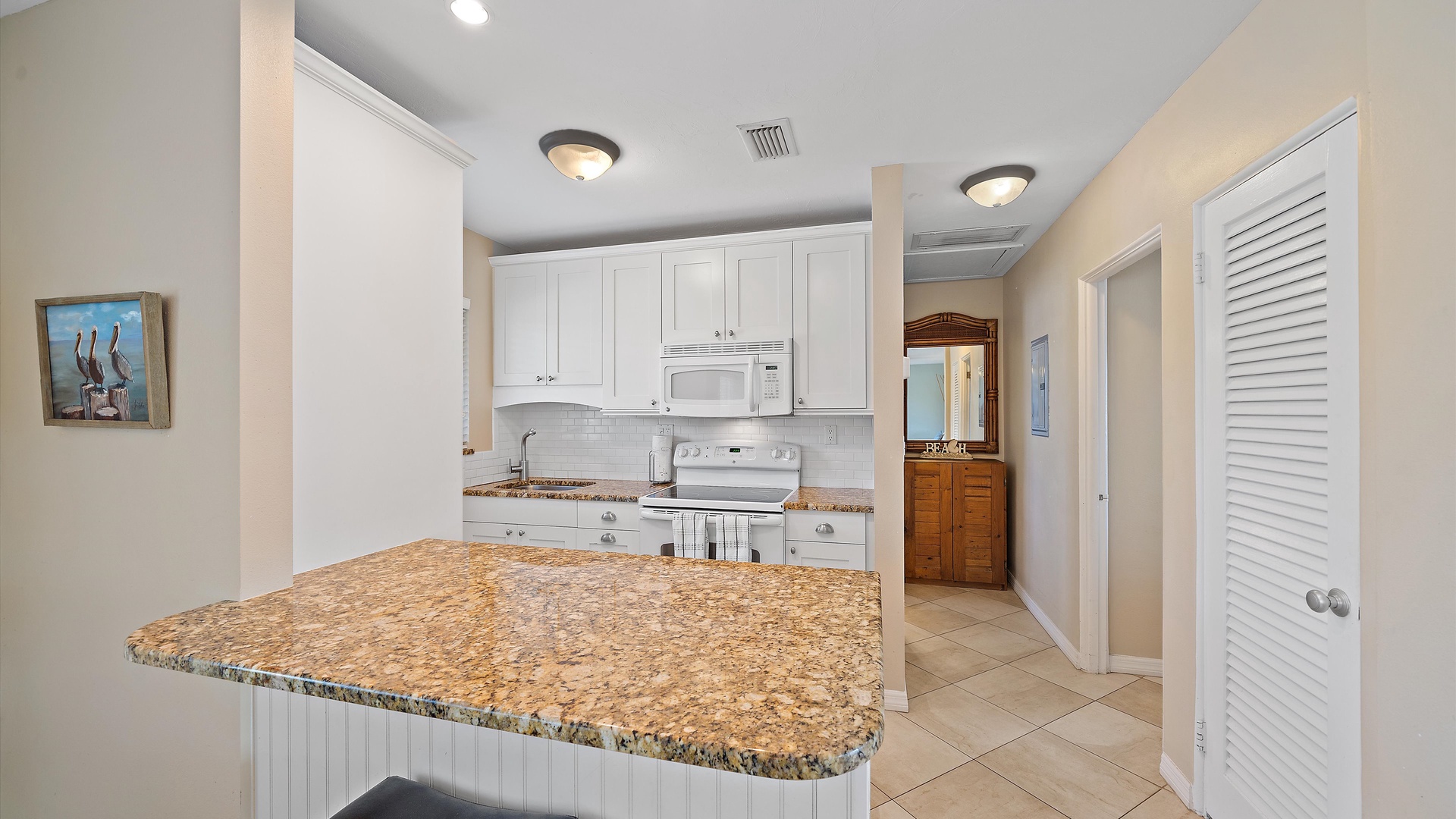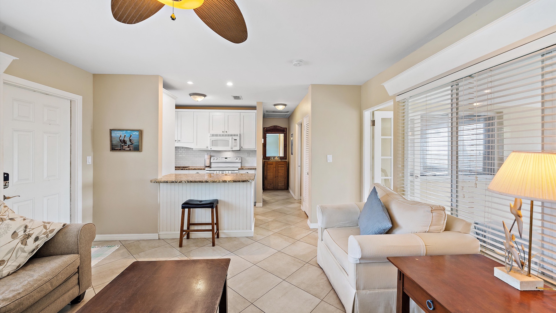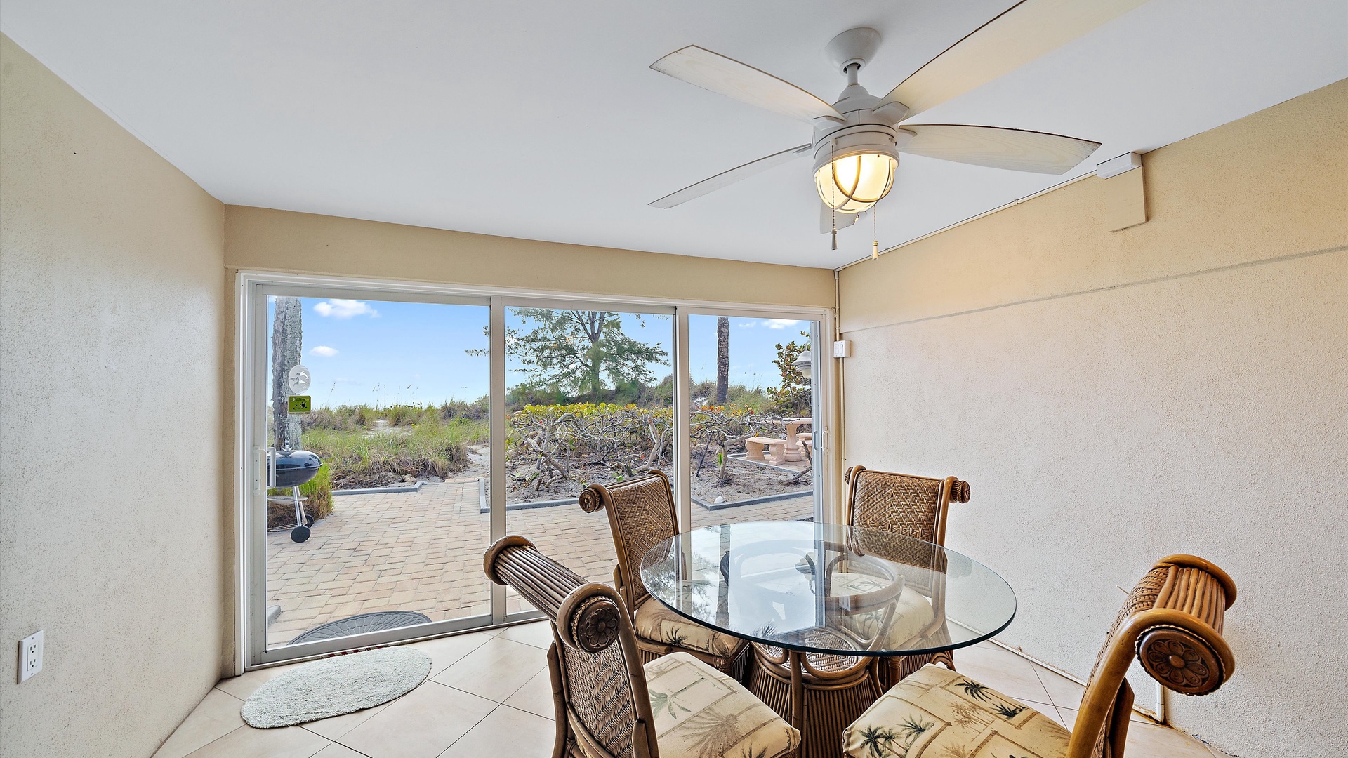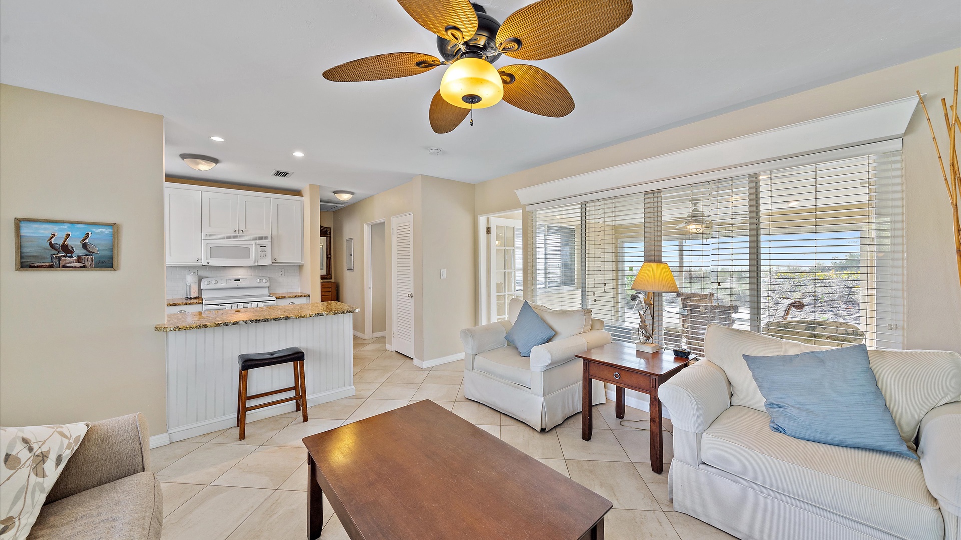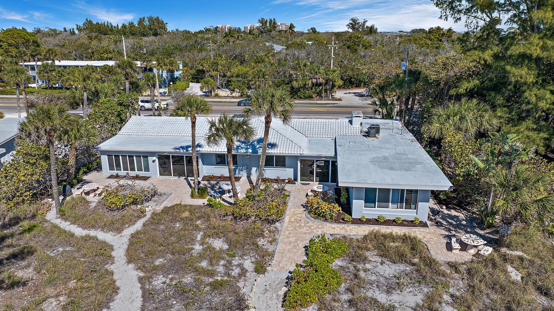 Las Hermanas 3 Home Florida Sarasota Las Hermanas 3 Las Hermanas 3 A cozy living room with a ceiling fan, two white armchairs, a beige sofa, a wooden coffee table, and a TV on a wicker stand. There's a large window and a door leading to a well-lit hallway. A bedroom with a large bed covered in a patterned duvet, a ceiling fan, a window with blinds, framed artwork, a bedside table with a lamp, a chair, and a dresser. A compact kitchen with white cabinets, granite countertops, an electric stove, microwave, refrigerator, and a small sink beneath a window with blinds. A small dining area with a round glass table and four wicker chairs, situated next to large sliding glass doors that open to a patio and garden view. A ceiling fan is mounted above the table. A modern bathroom with a granite countertop, single sink vanity, white bathtub with curtain, white tiled walls, and a window with shutters. There is a towel bar, overhead light, and round mirror. Open Gallery A cozy living room with a ceiling fan, two white armchairs, a beige sofa, a wooden coffee table, and a TV on a wicker stand. There's a large window and a door leading to a well-lit hallway. A bedroom with a large bed covered in a patterned duvet, a ceiling fan, a window with blinds, framed artwork, a bedside table with a lamp, a chair, and a dresser. A compact kitchen with white cabinets, granite countertops, an electric stove, microwave, refrigerator, and a small sink beneath a window with blinds. A small dining area with a round glass table and four wicker chairs, situated next to large sliding glass doors that open to a patio and garden view. A ceiling fan is mounted above the table. A modern bathroom with a granite countertop, single sink vanity, white bathtub with curtain, white tiled walls, and a window with shutters. There is a towel bar, overhead light, and round mirror. Oceanfront property with a sandy beach, a blue ocean, and a clear sky. The house has a driveway with a single car and is surrounded by trees and greenery. White plastic lounge chairs are scattered across a sandy beach area surrounded by tall grass and trees, with several single-story buildings in the background under a partly cloudy sky. A cozy living room with a beige couch, a wooden coffee table, a wall-mounted TV showing a beach scene, and a window letting in natural light. A ceiling fan with wooden blades is above. A cozy living room with beige walls, tiled floor, and a ceiling fan. It features a couch, armchair, coffee table, and a table lamp. An open kitchen with white cabinets is visible in the background. A cozy living room featuring two sofas, a coffee table, a ceiling fan, a small flat-screen TV, framed artwork, and large windows with blinds. A cozy living space with a beige sofa, two patterned pillows, and a lamp by a window with blinds. The room connects to a kitchen area with a bar stool, white cabinets, and a microwave. A cozy living room with a ceiling fan, a beige sofa, a wooden coffee table, a small TV, and a window with blinds. The door is next to the sofa with light streaming in through the window. A cozy living room with two white armchairs, a brown coffee table, and a ceiling fan. A kitchen area with white cabinets is visible in the background. Large windows show an outdoor view. A modern living room with a TV, wicker cabinet, beige sofa, and wall art. A granite countertop with white cabinetry is in the foreground. Windows with blinds bring in natural light. A compact kitchen with white cabinets, granite countertops, an electric stove, a microwave, and a small window with white blinds, offering a view of greenery outside. A compact kitchen with white cabinets, beige walls, granite countertops, an electric stove, a microwave, a small sink, and a window with white blinds offering a view of greenery outside. A kitchen with white cabinets, granite countertops, an electric stovetop, and a white microwave above it. A small door leads to another room in the background. A kitchen with beige walls and tile flooring features white cabinets, a white stove, a microwave, and a granite countertop. There's a framed picture on the wall and a hallway with a louvered door on the right. A cozy living room with a ceiling fan, white furniture, a wooden coffee table, and a TV displaying a scenic view. Large windows with blinds allow natural light. A kitchen countertop is in the foreground. A cozy living room features two white armchairs, a wooden coffee table, a wicker TV stand with a flat-screen TV, and a ceiling fan. The room opens to a sunroom with large windows and a table lamp. A cozy living area with white furniture and blue pillows, a wooden side table with a lit lamp, a window with blinds, and an open door leading to a bright, tiled sunroom. A sunlit room with light beige walls featuring a glass-top dining table and four wicker and wood chairs, a ceiling fan above, and large windows with a view into another room. A sunlit room with tiled flooring features a glass-topped table surrounded by wicker chairs, a ceiling fan above, large windows with an outdoor view, and an open door leading to another room. A sunroom with a glass table and four wicker chairs, a cushioned lounge chair, tiled floor, ceiling fan with light, and large sliding glass doors leading to an outdoor patio area. View through a glass sliding door to a patio with a grill, chairs, table, and greenery. Beyond the patio, there are trees, bushes, and a view of the sky and ocean. A sunroom with a ceiling fan, round glass table, four wicker chairs, and tiled floors. The room has large windows and an open doorway leading to an adjacent area. A sunroom with a wicker chair, a small table holding a microwave and fruit basket, large windows with blinds, and a glass-paneled door leading into the room. Bedroom with King bed Bedroom with King bed Bedroom with King bed A hallway leads to a bedroom; a wooden mirror and cabinet stand on the left with a "BEACH" sign, and a blue floral bedspread is visible t