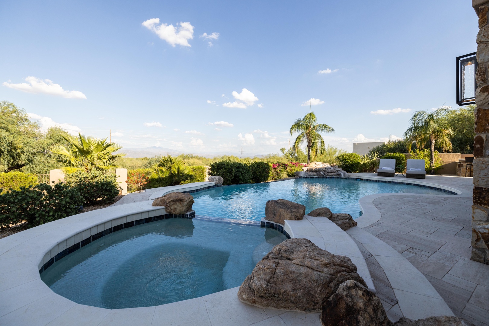 Wow! A sunshine lover's haven with heated infinity pool, hot tub, and pool table.