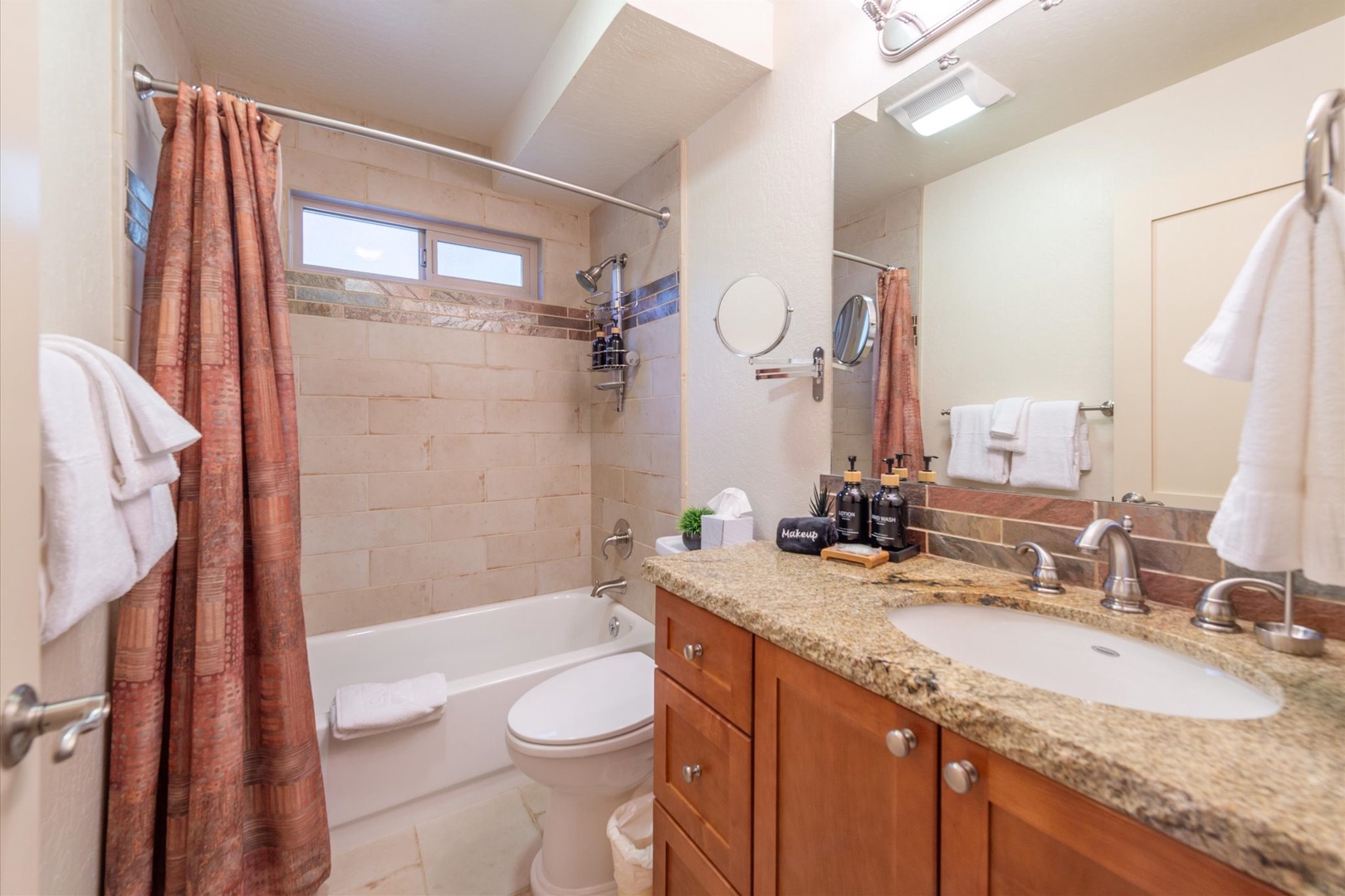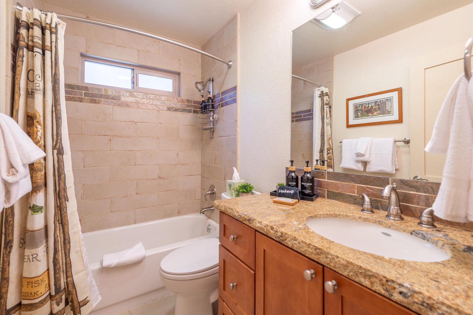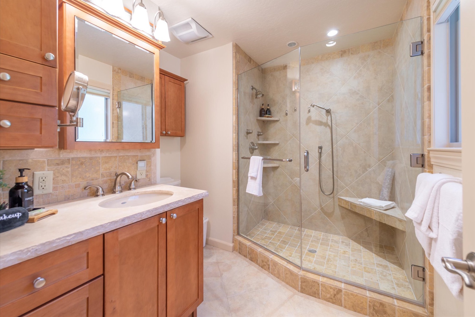 The main floor hosts three spacious bedrooms designed for restful nights. The first two guest rooms are perfect for kids or friends. The first offers a spacious Queen bed, and the second features two twin beds with lots of storage space. At the back of the home, the primary bedroom boasts a luxurious king bed and an ensuite bathroom complete with a large walk-in shower, providing a serene retreat after a day of exploring.