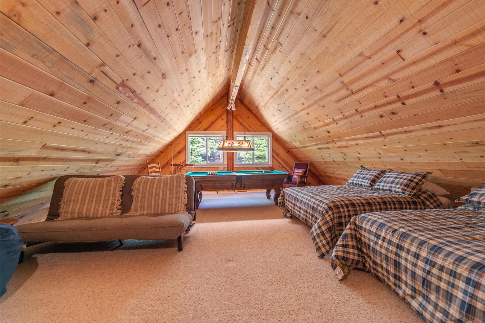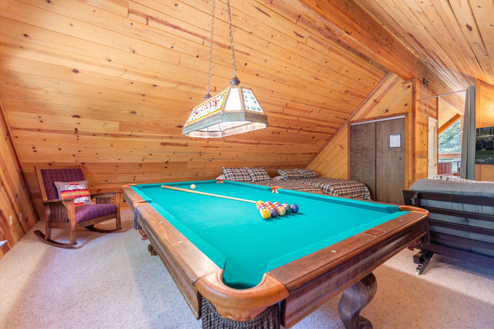 Venture upstairs to discover a charming open loft, equipped with a desk for those who need to catch up on work or plan their next adventure, along with a fun table perfect for playing cards or games with family. Just down the hall, you’ll find another full bathroom before entering the impressive bonus room. This spacious area features a pool table, a flat-screen TV, and a cozy seating area with two full beds—an ideal space for kids to unwind and enjoy their own hangout while the adults relax downstairs.